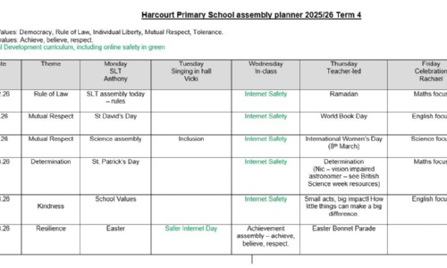 Each term we share with you an outline of the content of the assemblies that we lead in school. Over the course of the year we focus on special days of celebration, internet safety and Spiritual, Moral, Social and Cultural Aspects of the National Curriculum.